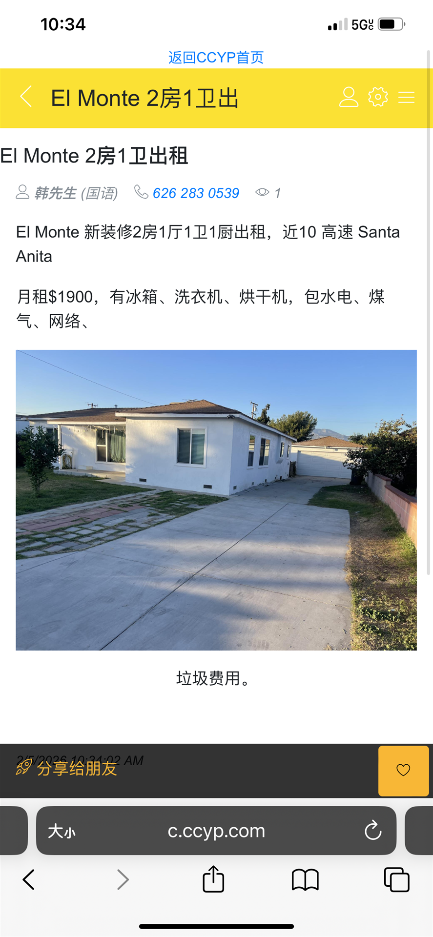 爱满地 El Monte 2房1厅1卫1厨独立屋出租
